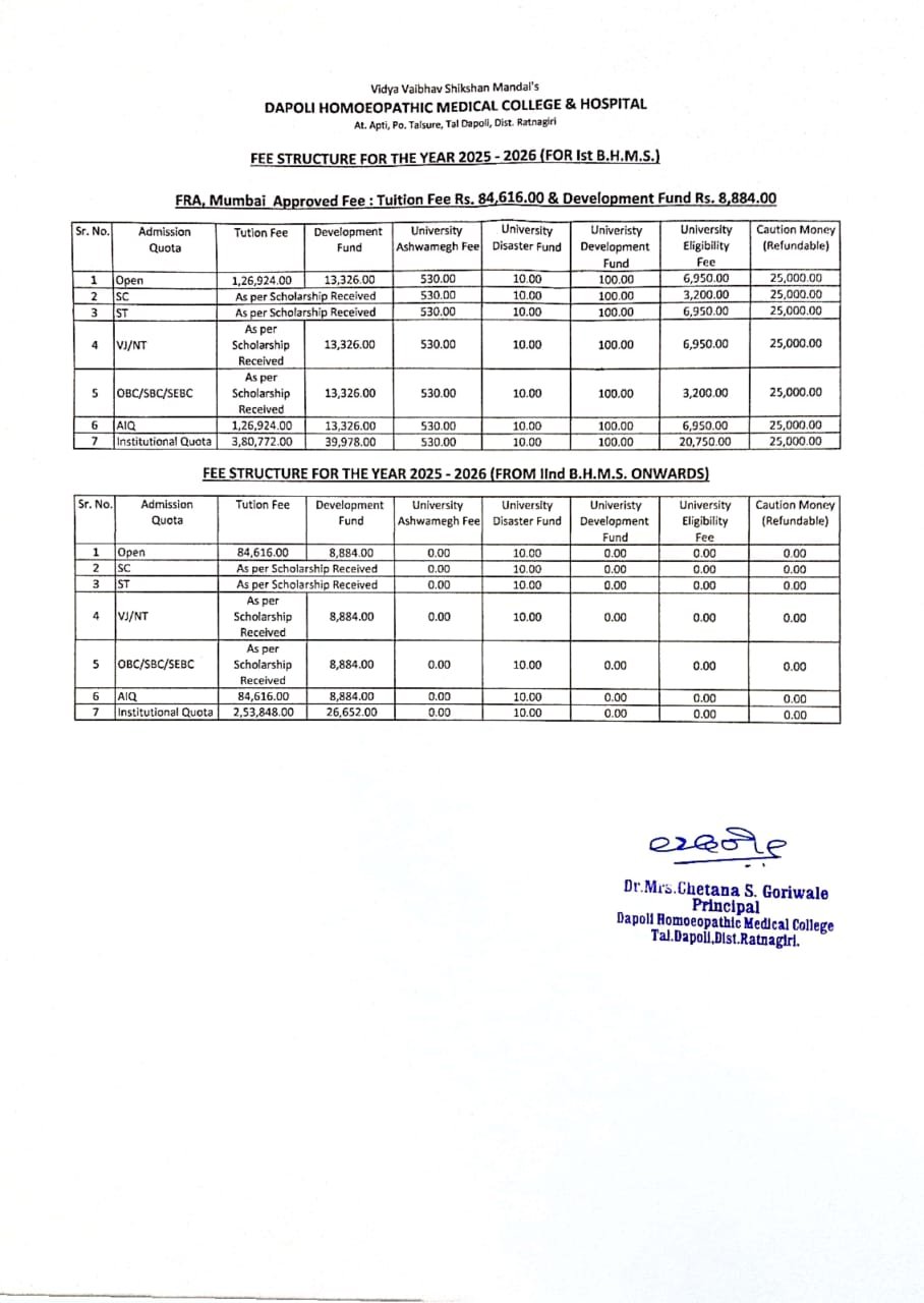 - D. D. of Rs. 1,40,250/- in favour of Dapoli Homoeopathic Medical College, payable at Dapoli (for State Quota)